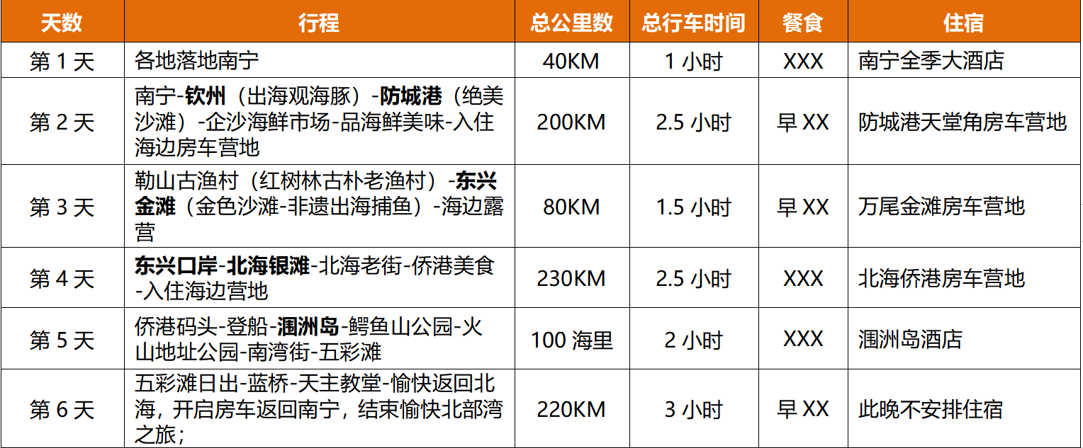 房车租赁:上汽MAXUSRV80 C型房车5天使用费,含车辆清洁费; 房车布草:定制房车布草,床单,被子,枕套等; 景区景点:钦州出海观看白海豚/东兴金滩出海打鱼; 用餐安排:全程酒店含2早,不含正餐; 房车露营:包含3晚海边营地(1晚防城港天堂滩营地,1晚万尾金滩营地,1晚北海侨港营地); 住宿安排:D1:南宁全季大酒店或同级; D5: 涠洲岛酒店, 贴心保障:含车辆保费免赔保障+车损免赔保障(免赔额度1万)+旅游人身意外保险; 精致露营:含户外蛋卷桌+露营椅子(含一桌四椅),户外露营星星灯50米一串; 儿童说明: 1岁-12周岁,12岁以上儿童视为成人,按成人价收取费用。 儿童包含:全程所示门票+房车座位费+行程中所含营地费用+保险费及其他杂费(车辆保险,保障等费用均摊);