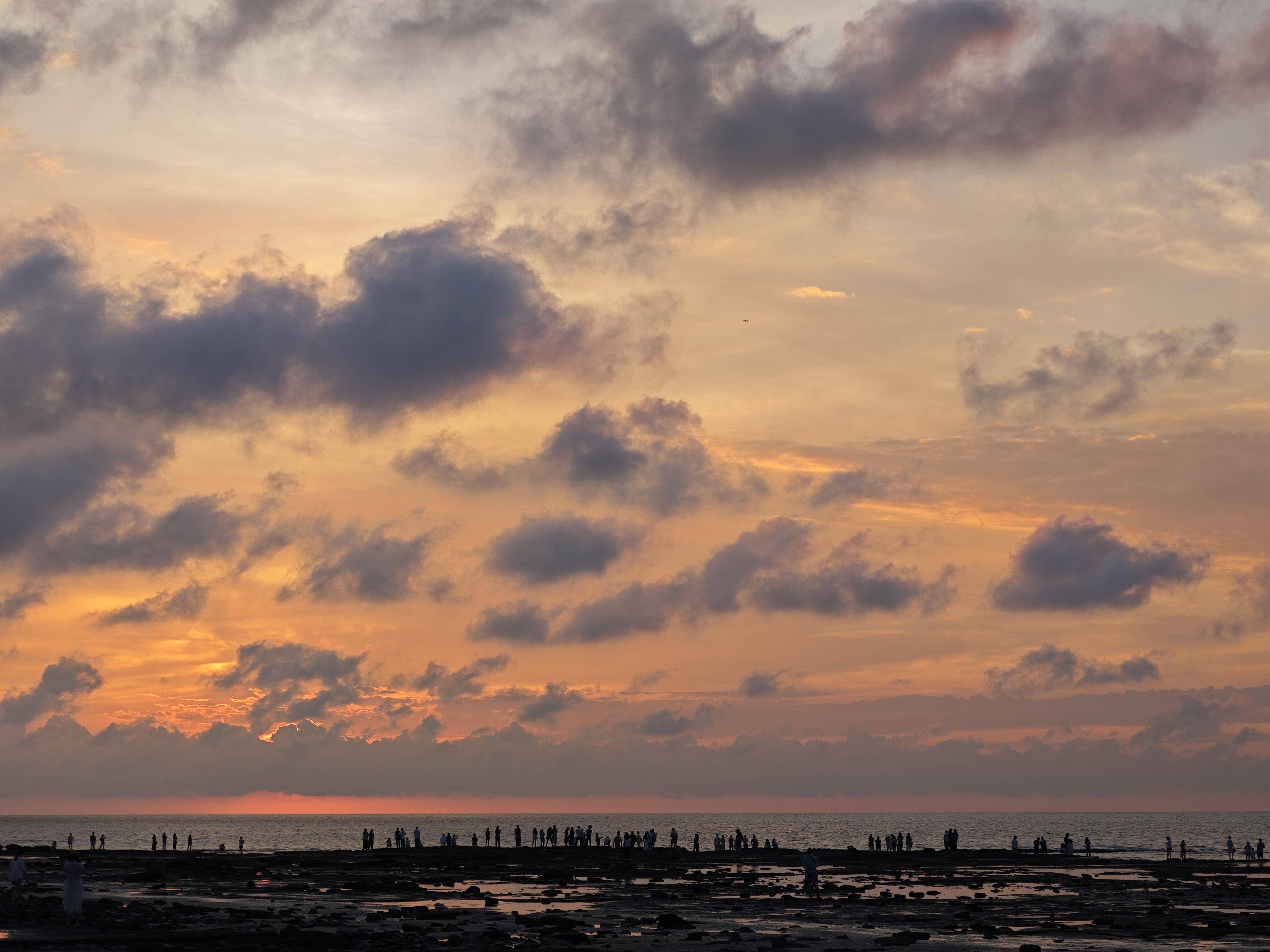 ■上午: 在舒适中醒来,海岛度假就是这样的吧, 酒店用早餐;可以早起五彩滩观日出地质与光影交织,退潮后裸露的黑色玄武岩平台布满蜂窝状气孔,7000 万年前的火山遗迹在晨光中呈现黑、褐、黄、红渐变,与海平面的金色光带形成强烈对比。阳光以 15° 低角照射时,岩缝积水形成 “天然镜面”,倒映橘色霞光,宛如大地调色盘。