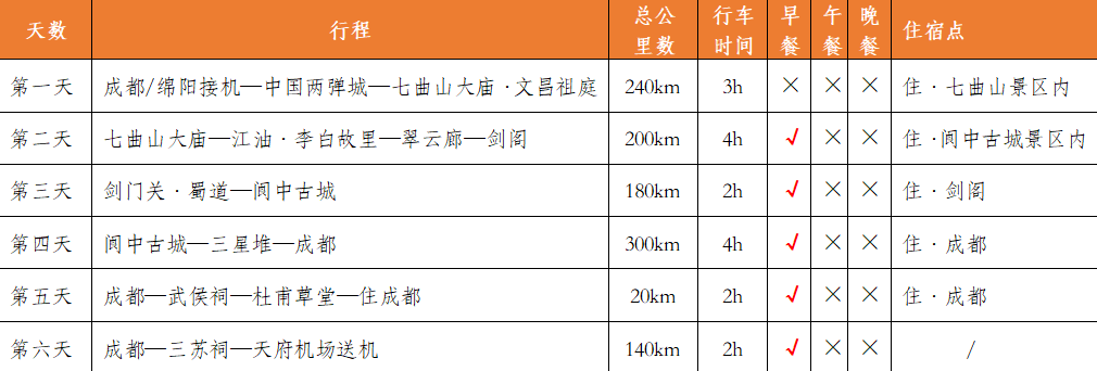 1.【接送机/站】:以家庭为单位,独立用车。接送机/站为双流机场/天府机场/成都动车站; 2.房车租赁 :上汽 MAXUSRV80C 型房车 4天租赁费(含车辆基本保险、车辆清洁费); 3.房车布草 :房车床上用品布草 2-4套(包含 :枕头、被子、床单) 根据报名人数配置; 4.房车司机代驾服务 (1).房车管家代驾服务 (2).房车管家食宿补贴 (3).房车管家交通补贴 (4).全程油费 (5).全程程过路费 (6).全程停车费 5.每车物资配备 : ✅ 折叠桌椅一套(1桌4椅) ✅ 高原炉具(气罐X1+高原炉具X1) ✅ 高原锅具1套(1烧水壶+一个煮锅+一个煎锅) 6.【住宿】: 住宿城市 酒店标准 参考酒店 第一晚 梓潼 携程4钻标准酒店 梓潼七曲山大酒店或同级 第二晚 剑阁 携程4钻标准酒店 麗枫酒店或同级 第三晚 阆中 携程4钻标准酒店 美豪丽致酒店(阆中古城店)或同级 第四晚 成都 携程5钻标准酒店 成都索菲斯锦苑宾馆或同级 第五晚 成都 携程5钻标准酒店 成都索菲斯锦苑宾馆或同级 5、【关于门票&活动】: ✔三苏祠门票+讲解 ✔武侯祠门票 ✔杜甫草堂门票 ✔三星堆博物馆+讲解 ✔剑门关门票(现场背诵《蜀道难》,免门票退门票差价)+往返索道票 ✔阆中古城小景点+天宫院通票 ✔梓潼大庙门票+观光车 ✔翠云廊门票 ✔李白博物馆门票+讲解 ✔阆中古城·醋泡脚+推拿按摩 6、【餐食】:酒店含早餐,其余餐食推荐当地,地道的小吃(本地人喜欢的,非旅游区小吃,餐标不高,且味道巴适) 早餐 午餐 晚餐 第一天 自理 自理(集合日) 自理:推荐地道的绵阳米粉&梓潼片芬 第二天 酒店早餐 自理:特色餐·江油肥肠 自理:自理:推荐(剑阁本地麻辣串) 第三天 酒店早餐 自理:剑门豆腐宴 自理:推荐(张飞牛肉面) 第四天 酒店早餐 自理:中餐 自理:中餐或成都麻辣串 第五天 酒店早餐 自理:地道成都小吃 自理:特色餐·大妙火锅(边看川剧变脸等表演,边吃火锅) 第六天 酒店早餐 自理:眉山特色小吃 自理(已散团) 7、【赠送项目】: ✔矿泉水按需提供,不限量。 ✔零食礼包,随机水果。 8、【旅游保险】:80万保额旅游意外险 旅行社(甲方)为游客(乙方)提供的安全保障措施包括但不限于:为游客(乙方)投保人身意外险,游客(乙方)若发生意外事故,旅行社(甲方)负有责任的,旅行社(甲方)有权 优先使用人身意外险的理赔承担赔偿责任。 游客(乙方)同意并授权旅行社(甲方)作为人身意外险的投保人为游客(乙方)订立保险合同。 9.行程说明: 用车 服务人员 第1天至第4天 房车 司机兼领队+景点讲解 第5天 打车+公共交通 全陪导游 第6天 商务车 司机兼领队