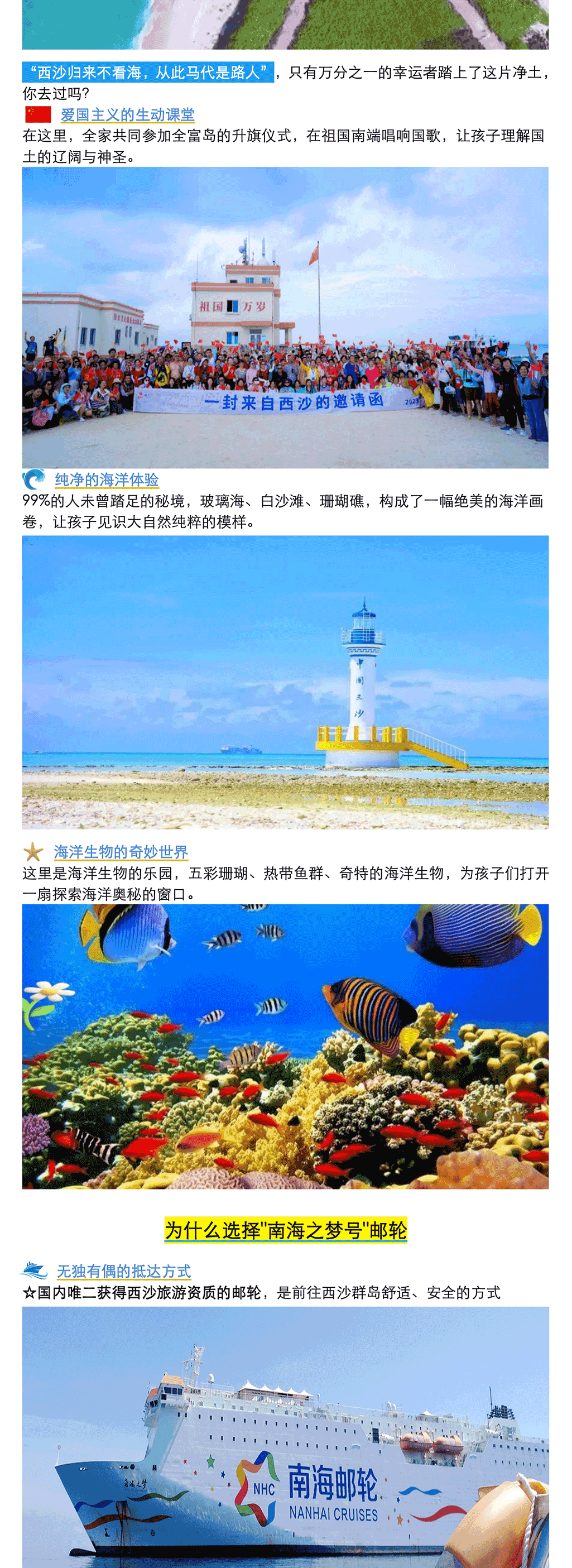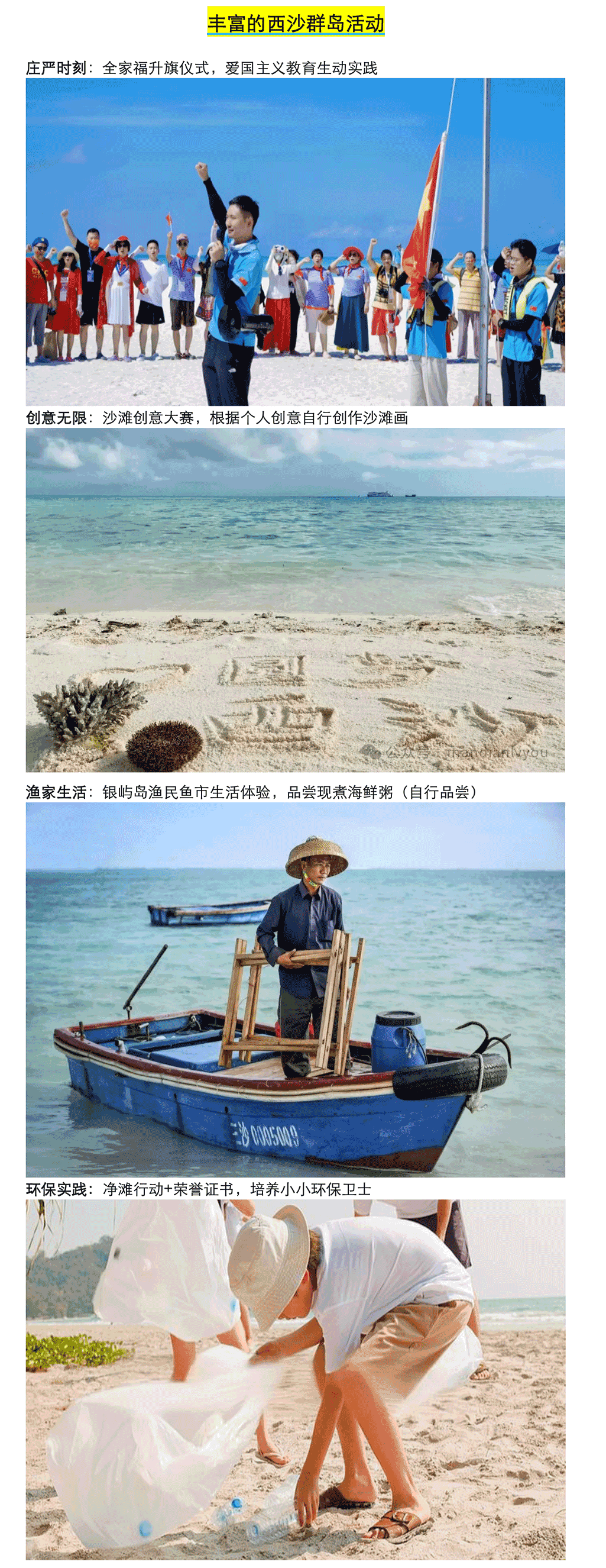 活动: 【西沙环保小卫士】。在工作人员组织下,全家一起参与净滩活动,捡拾海洋垃圾,培养孩子的环保意识。