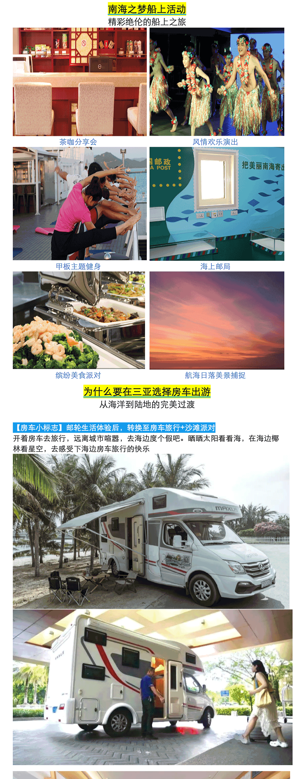 当日房车送至三亚送至邮轮集合点,房车及房车司机管家服务结束,后期邮轮上由专人对接负责安排
