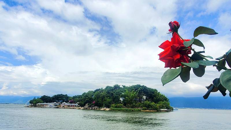 乘船上了前往南诏风情岛的渡船,排队不长、渡轮很快,所以体验感尚可。在写有“南诏风情岛”景区门口大石头前来张游客照是必备打卡招数,进入景区再排队乘坐电瓶车,一共有三站,前两站是两个观景点,其中第一站有一个观景台(有若干个古迹,但是完全没来得及细品,全把时间花在与景合影了),第二站因没有第一站景大而被放弃,第三个就是终点站(剩余的时间在洱海边吹吹风还是很惬意的)。由于时间比较紧张所以玩得很赶,一小时的时间只能走马观花,还差点上不了电瓶车(因为客人都不下车)。有时间的话既然上岛了就慢慢走,洱海的水天一色还是很美的,再吃一根景点雪糕也算没有白来。