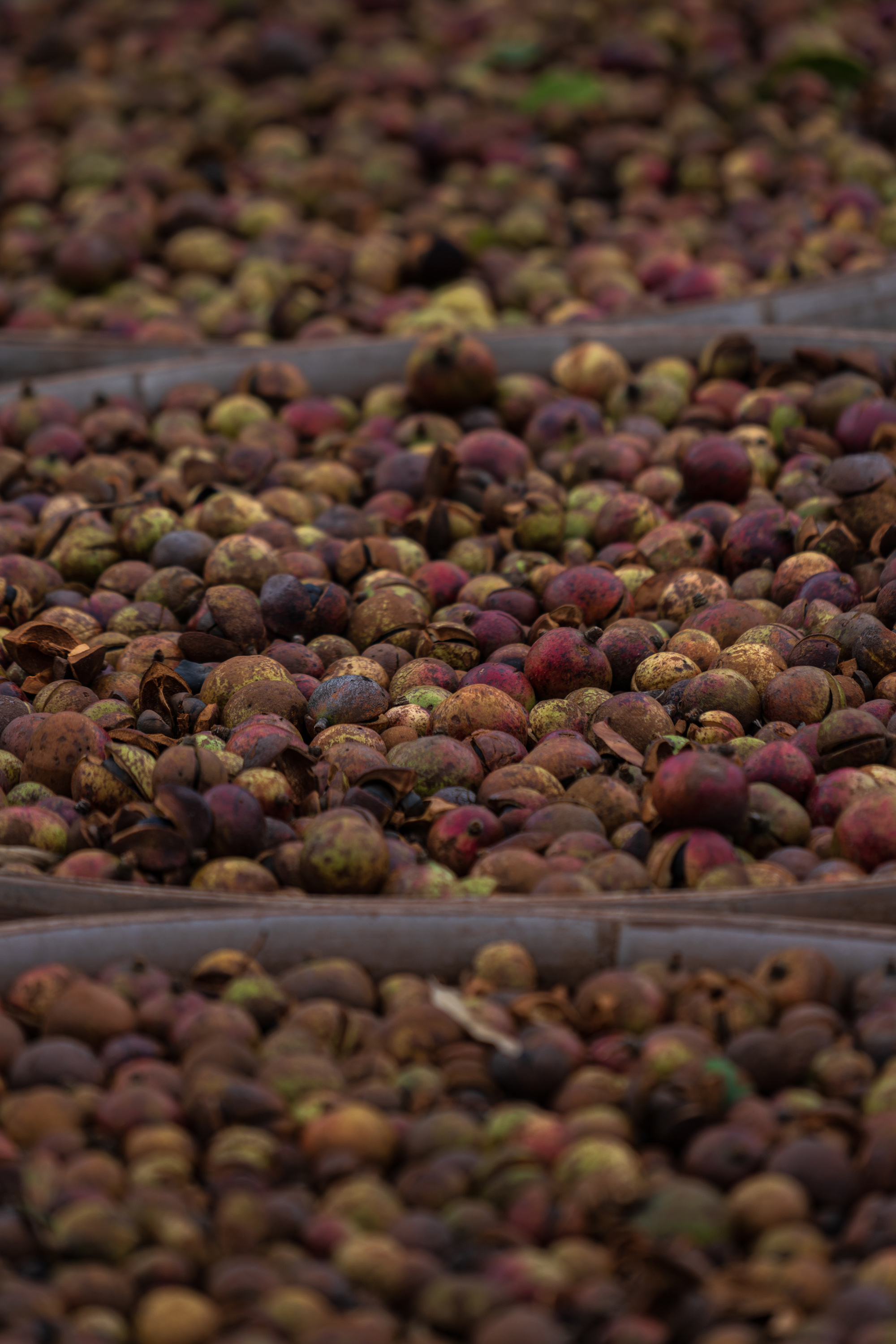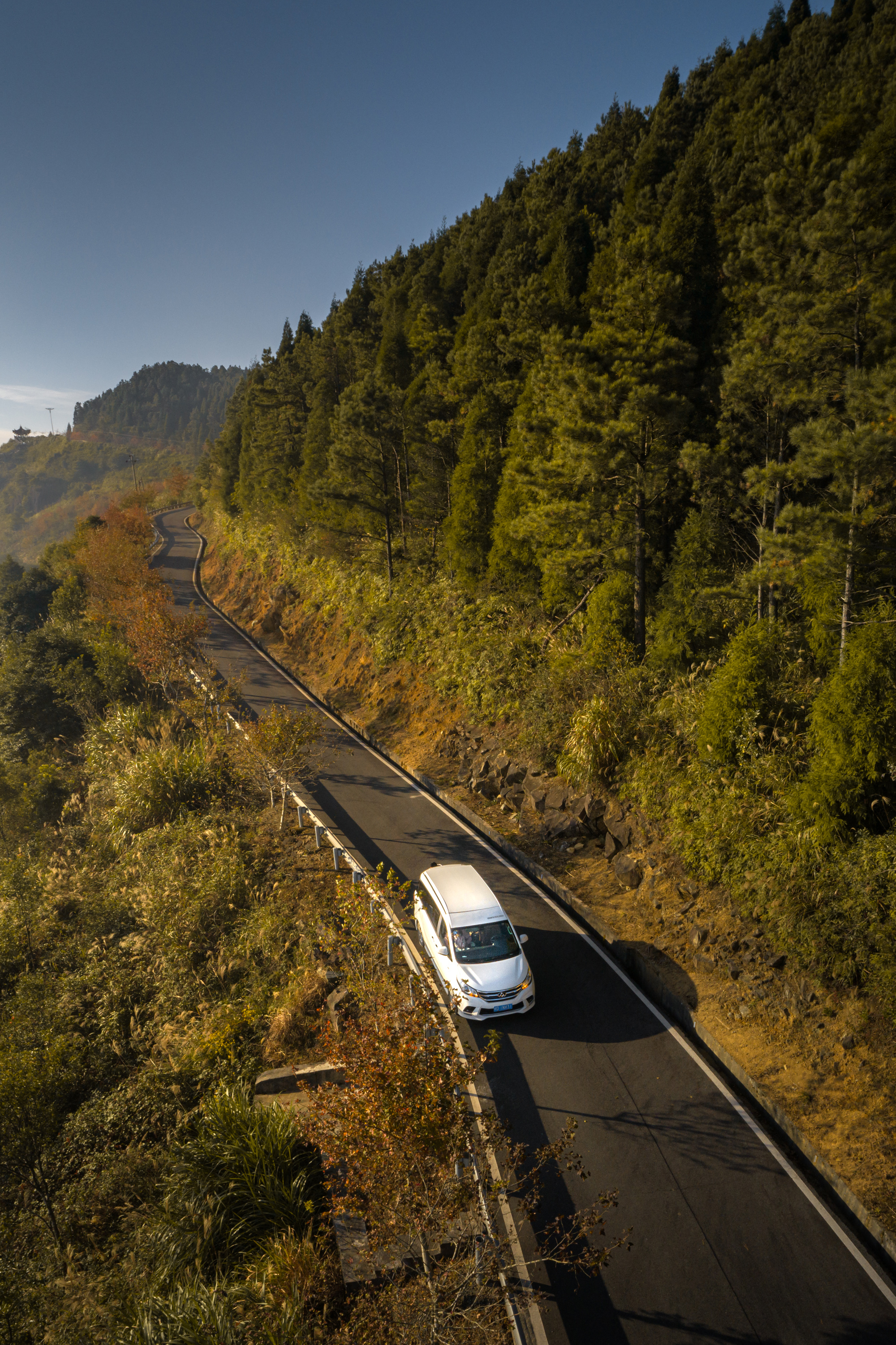 太阳渐渐升起,云雾慢慢散开,路途的景色更加清晰了。时下正值茶籽的采摘季节,周边可见村民晒制茶籽榨油用,由于昨天过来时下雨加上大雾,没有看到风景,早上的风景让我们如痴如醉,秋色的红黄绿交错在山林中体现的淋漓尽致。