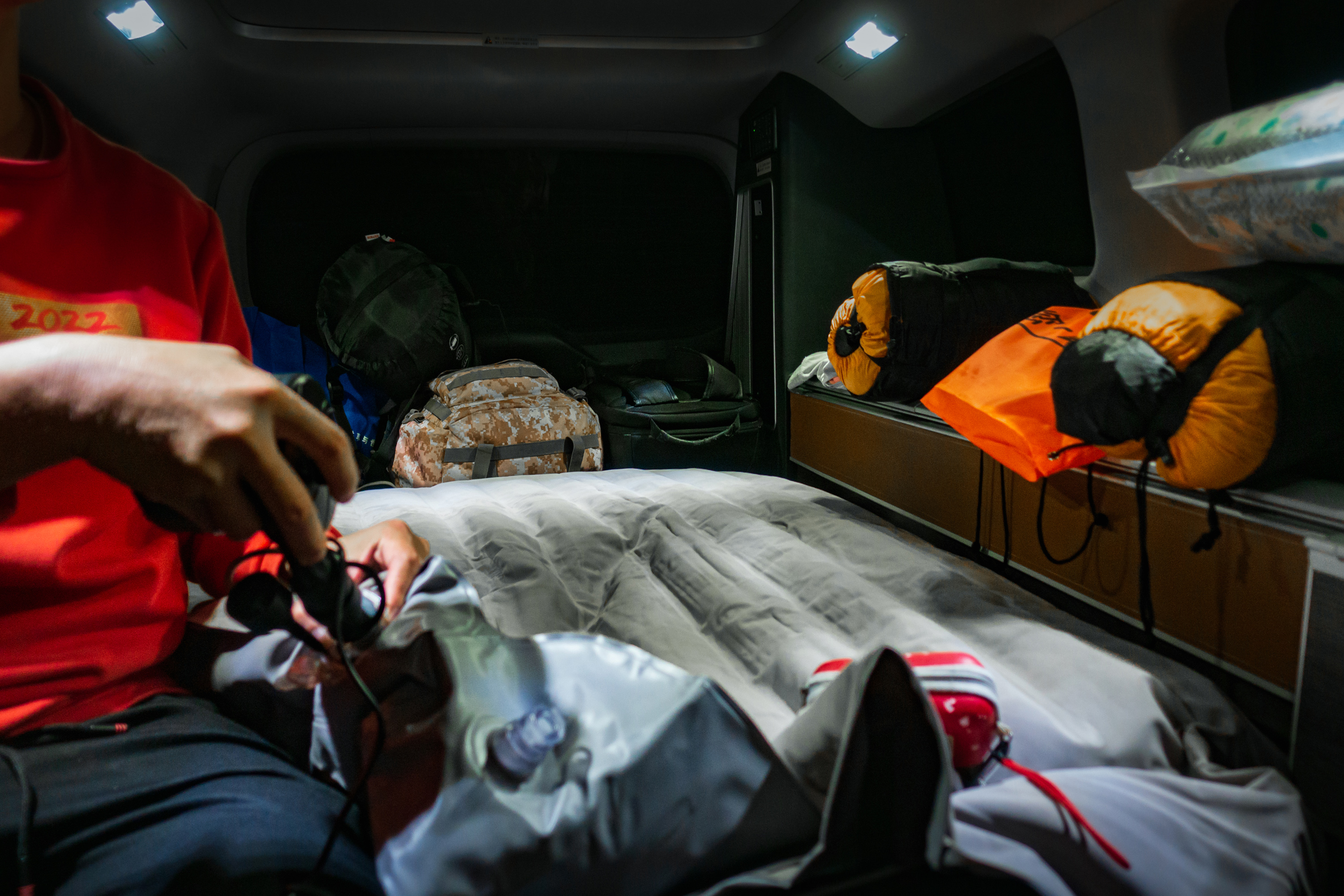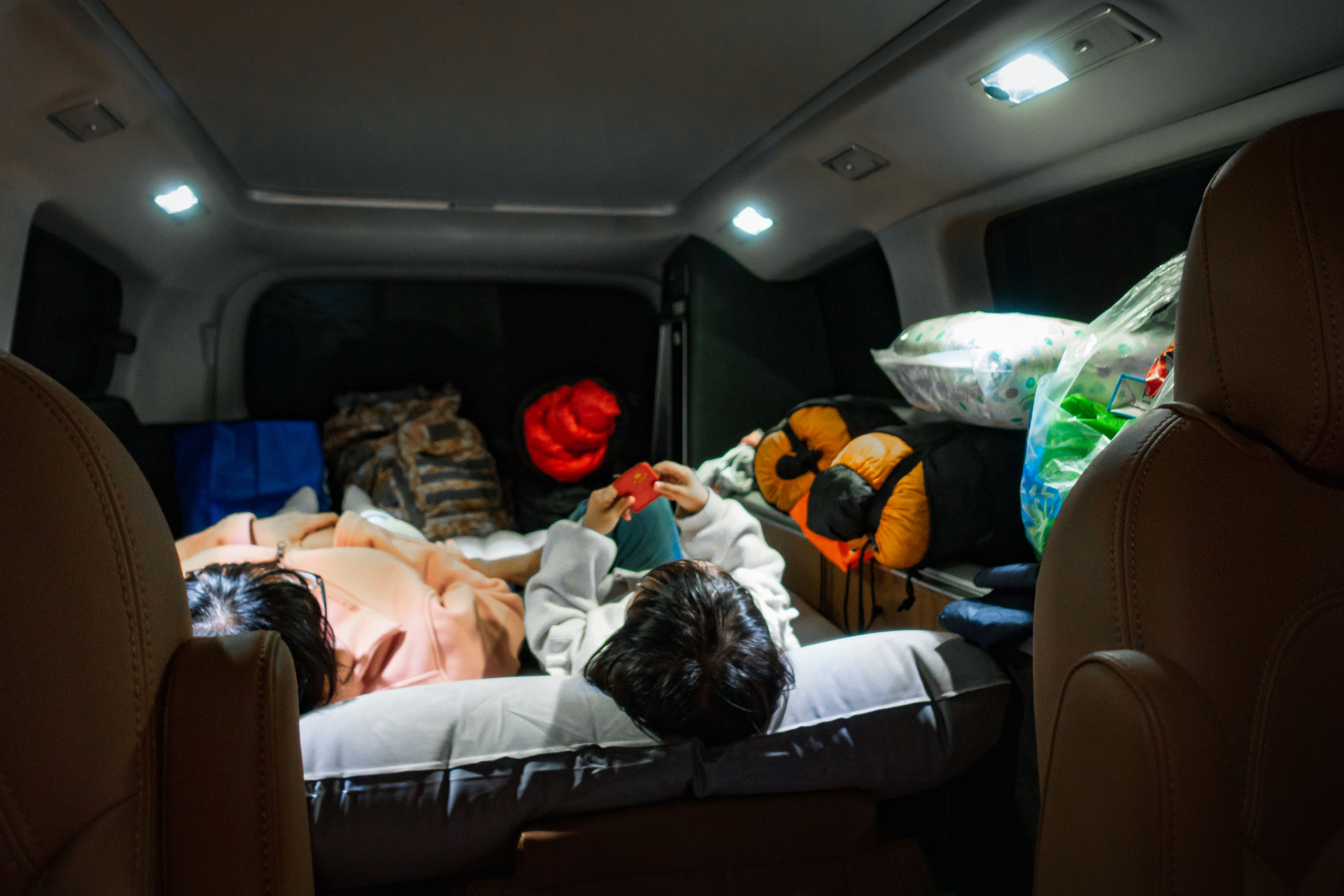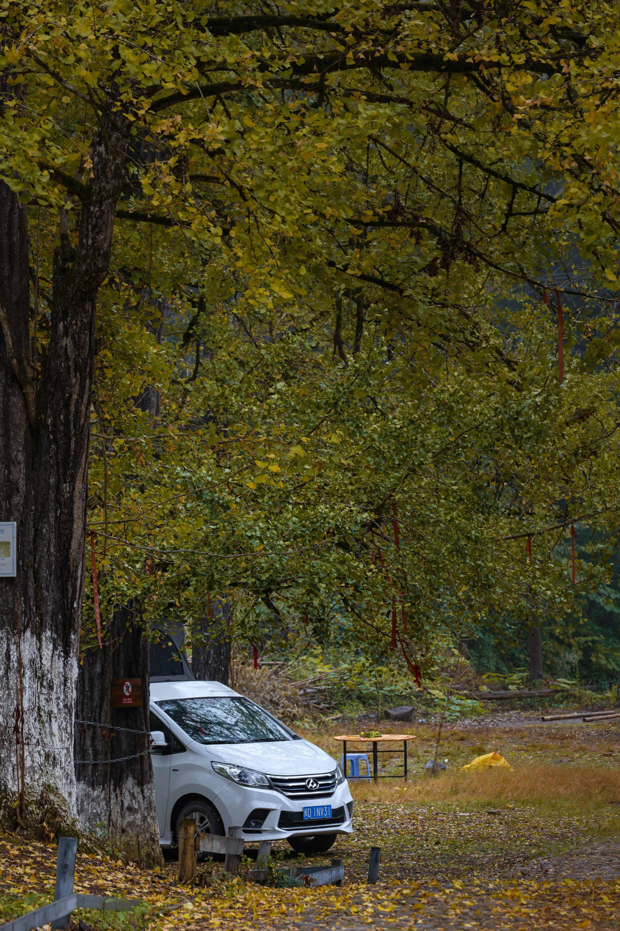 吃饱饭进行简单洗漱后我们把车开到银杏林里,打算就在银杏林里歇息了。简单把东西收拾,把充气床垫打上气摆好,往上面一躺,哎哟,不错!挺舒适!再把睡袋摊开变成被子,盖上,嗯,够暖了。