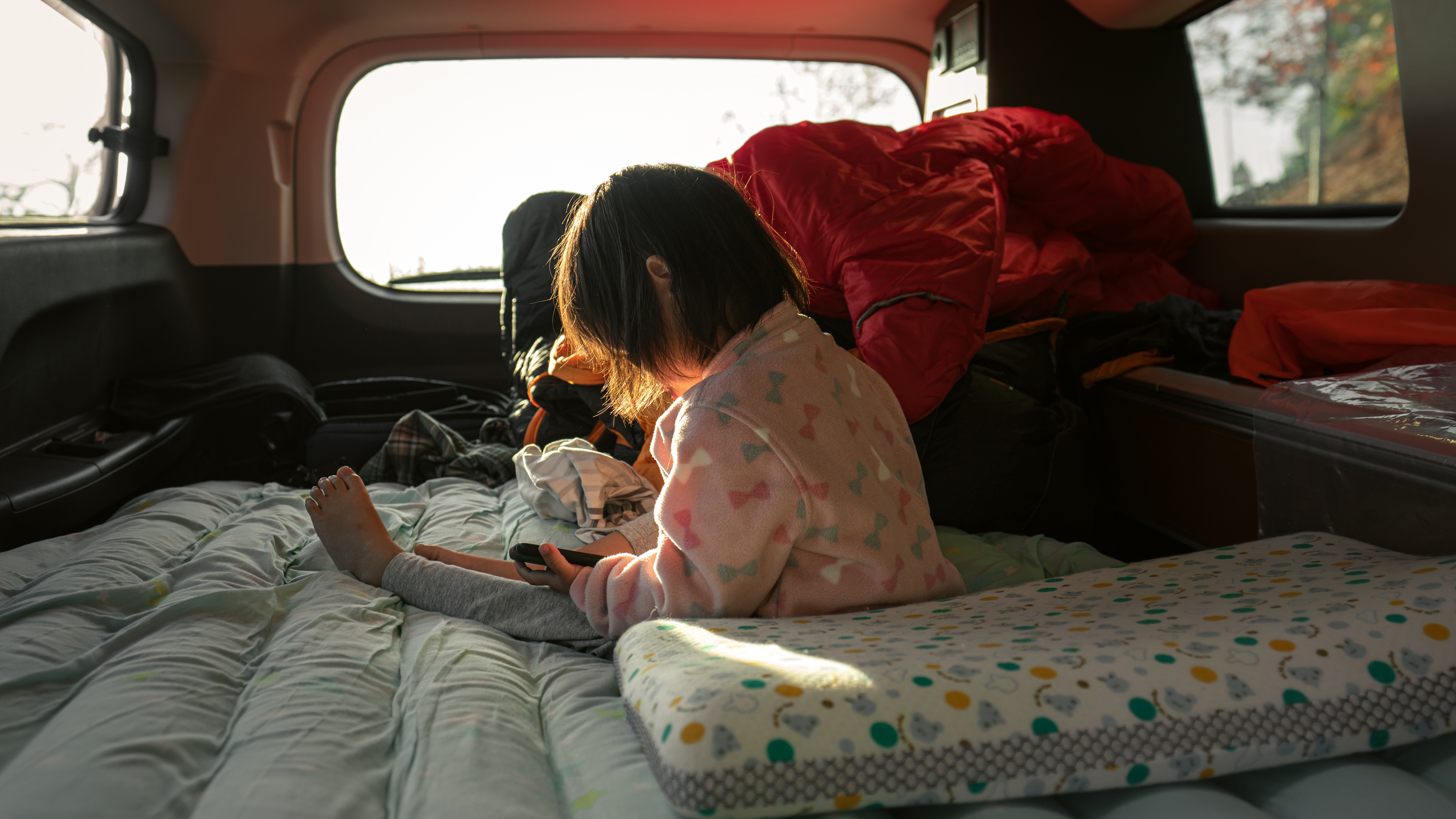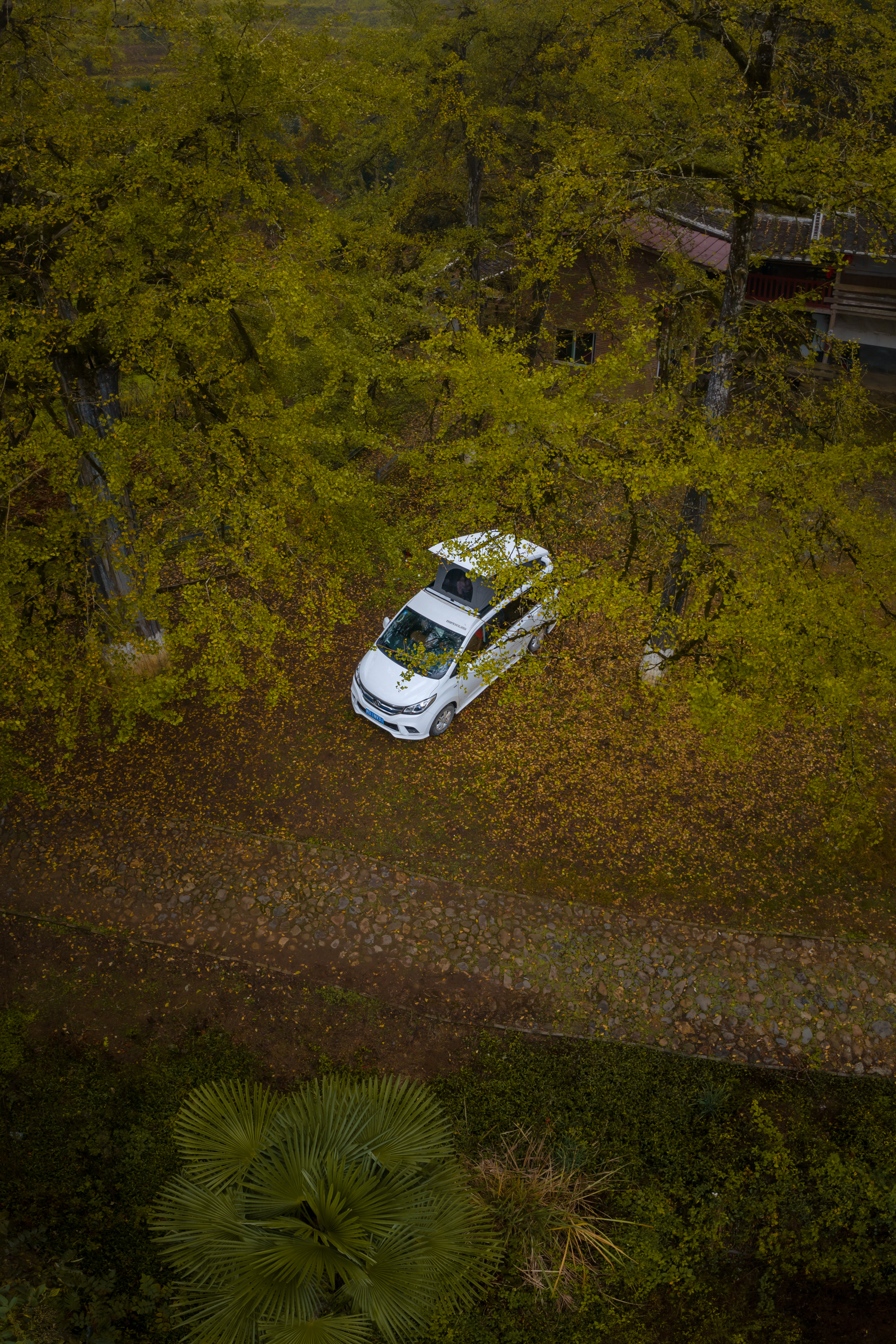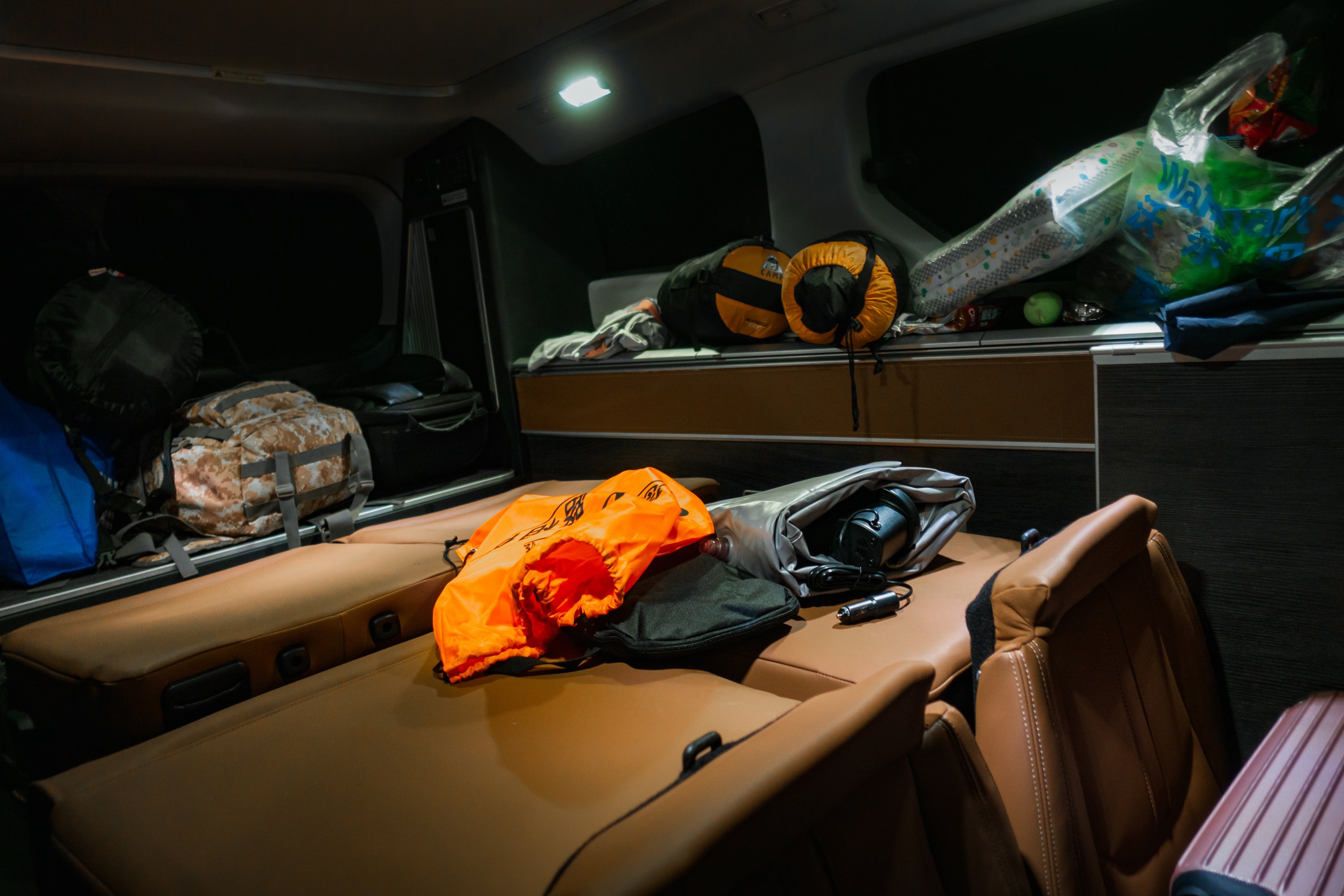 吃饱饭进行简单洗漱后我们把车开到银杏林里,打算就在银杏林里歇息了。简单把东西收拾,把充气床垫打上气摆好,往上面一躺,哎哟,不错!挺舒适!再把睡袋摊开变成被子,盖上,嗯,够暖了。