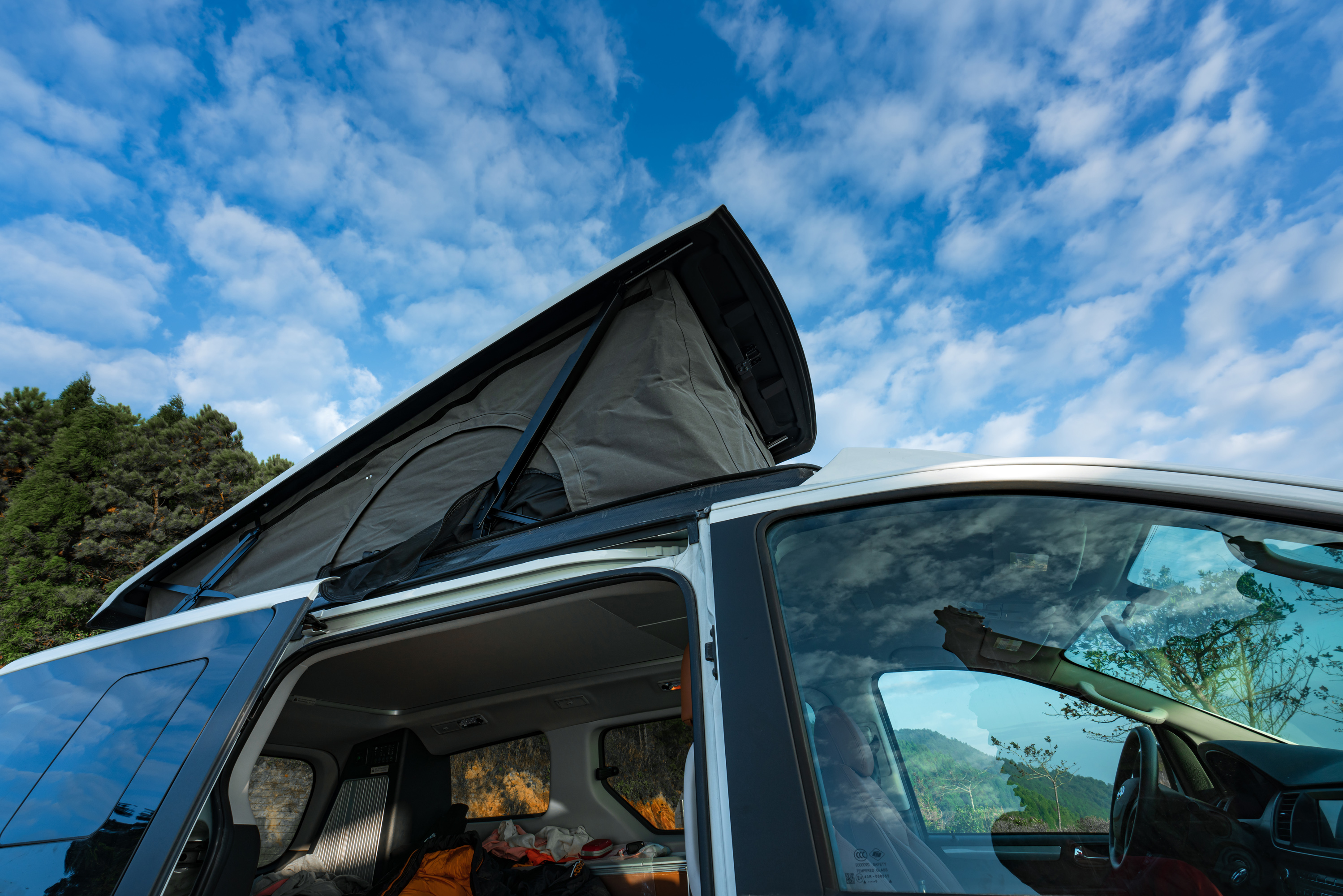 很快到了中午时分,肚子有点饿了,我们找了个平坦的地方开始煮面吃,车上配有电磁炉,自带锅和粮食就可以自行煮食了。吃饱后把车顶升起来,在车里美美地睡上一觉,醒来继续精神百倍地出发~